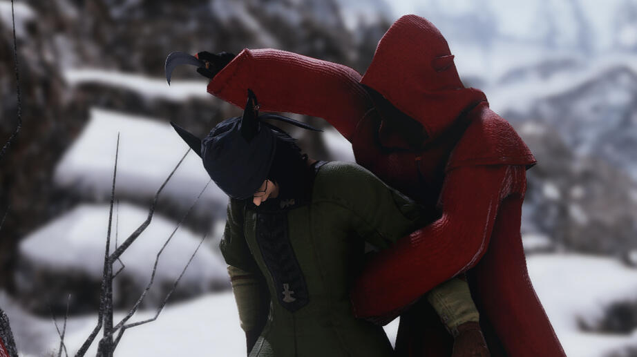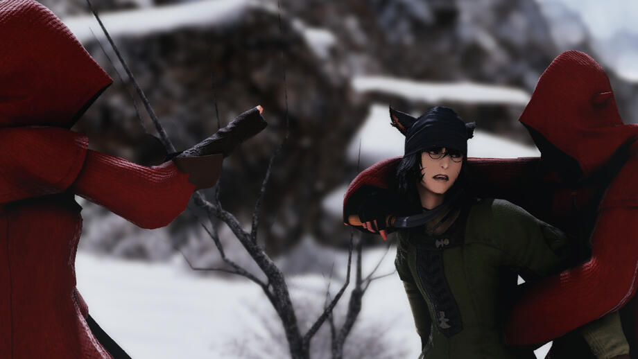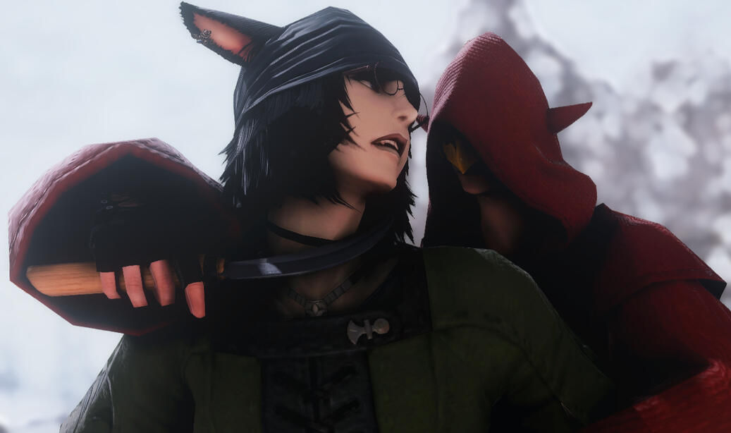 On the brink of death, Enok awoke in a melted ditch in Coerthas Central Highlands near Dragonhead yet still a distance away from Ishgardian Scouts. To his surprise he knew not why he laid bloody, sore from the gash across his throat and freezing. The only thing he found of any use was his bandana and the scorched remains of two unfortunate souls beside him. Binding his neck the best he could, he scooped the skulls of the pair without thinking and rose to try and find someone to aid him.It was during this grueling walk, that he was stumbled upon by Lady Saphelle Jienuex and her manservant. Taken in, he was nursed back to health over the course of nearly two weeks and when asked about the incident, he could not answer. In his belongings was a slip of parchment signed by a Qih'a Lihzeh and Enok mistook this as his own name when inquiries of this individual came up empty. After being seen by additional physicians it was clear he had suffered amnesia after the traumatic experience, and despite Lady Jienuex knowing the miqo'te that now was in her care it was decided to continue the ruse until such a time when his memories would return.
